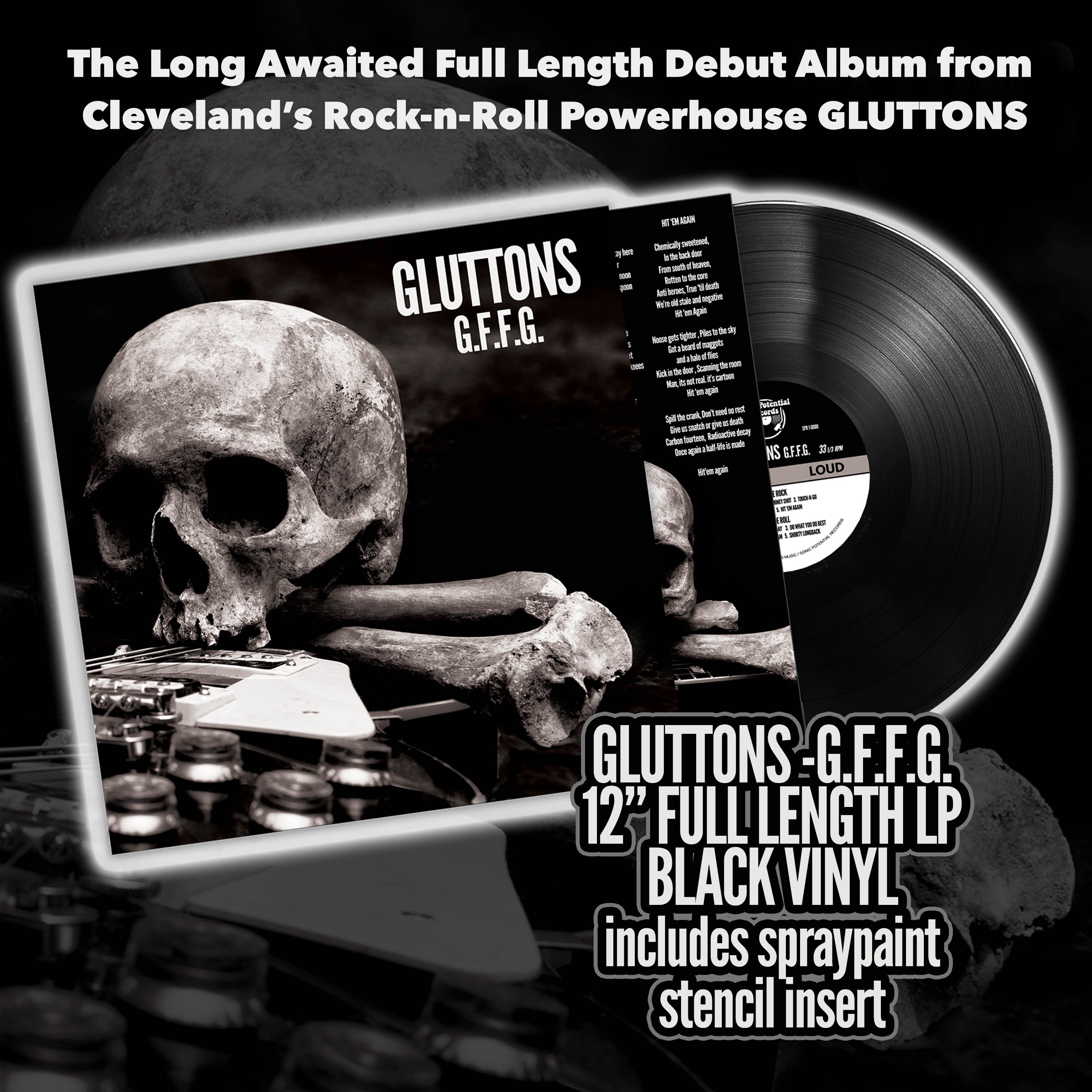 GLUTTONS - G.F.F.G Debut Full Length LP on Black Vinyl. 10 Blistering rock-n-roll cuts. Comes with Gluttons logo Spray paint re-usable Stencil insert. Limited to 300 copies.
